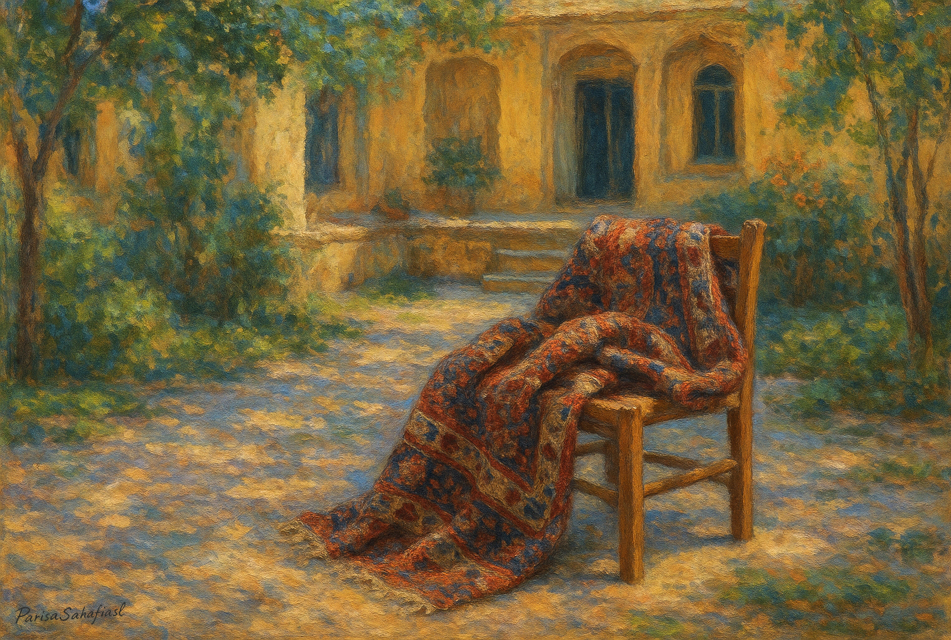 The painting depicts a wooden chair draped with a Persian carpet, set in a Persian house. The carpet is predominantly red and blue with intricate designs. The chair sits on the ground covered with fallen leaves, and a building is visible in the background. The building has arched windows and a door, suggesting a Persian architectural style.