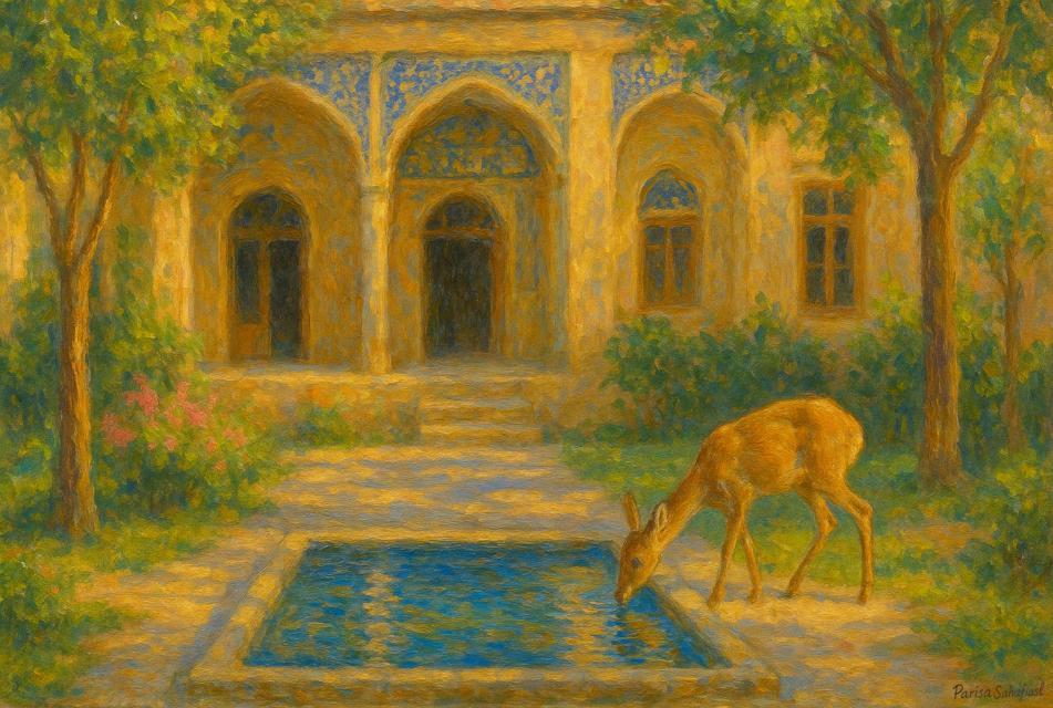 A painting depicts a deer drinking from a rectangular pool of water in a courtyard of a Persian house. The courtyard features a building with arched doorways and windows, adorned with blue and yellow tilework. Trees frame the scene, casting dappled light on the ground. The overall colour palette is warm, with shades of blue and green dominating the composition.